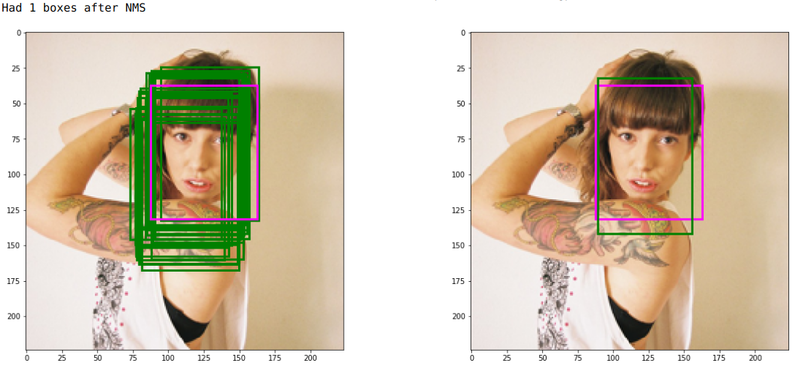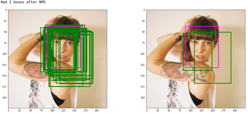 E.g. in this image (on the right), the box that contains the right part of the face (and a lot of non-face space) has the most detection confidence, and it suppresses most other boxes. (The green boxes are the predictions, the pink box is the GT). That “best” box fits the face so poorly that another, second box for the same face survives the NMS. Indicatively, that box approximates the face better.