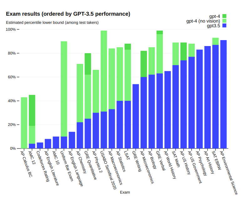 Task performance metrics. E.g. the GPT-4 announcement contains a whole chart of the model’s performance on a variety of tasks such as Entry Exams, reading comprehension, etc. These metrics are very successful at showing us that one doesn’t have to be human to be good at passing entry exams, but also not every human can pass.