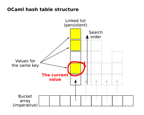 The hash table implementation in OCaml, in addition to the expected capabilities, can also keep the history. So if you add several values for the same key, you may either query the latest value added (via find method), or query them all in the order of appearance (via find_all counterpart). Of course, you can also remove the latest binding of a key (via the remove method), so that the subsequent finds will return the previous value it was bound to.