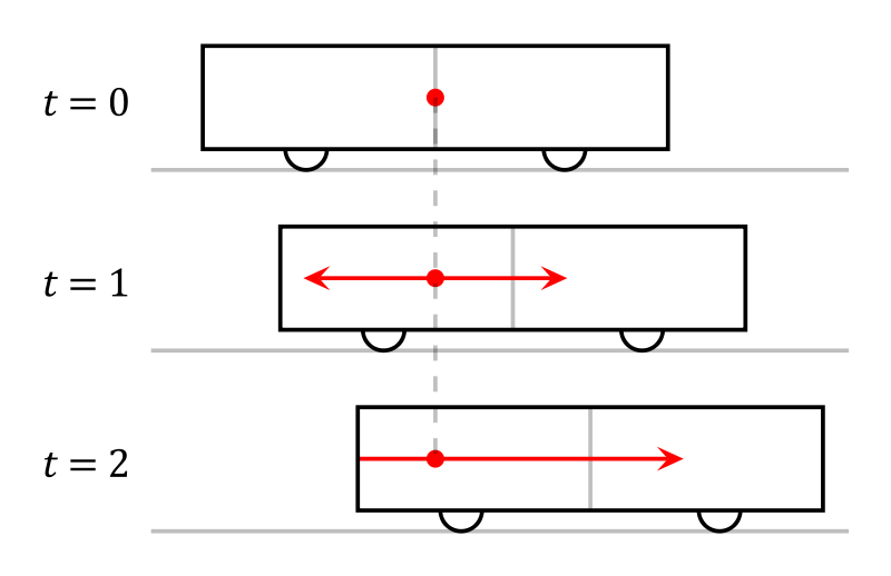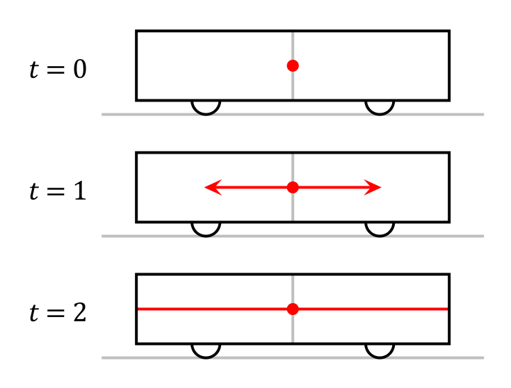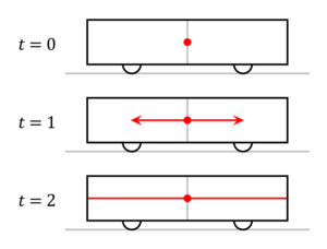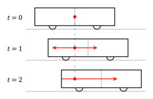 Assume that a train car is passing you when you're standing on a station platform. The train car has a lamp installed exactly at its middle. When the train passes you, a lamp flashes, and then you watch when the light reaches the front and the back of the car. It's interesting that those who sit in the car will notice the light hitting the two walls simultaneously, while those who stand at a platform will notice the back wall lit earlier than the front one. This is implied by the postulate described above: as seen by a spectator on the platform, the light propagates with equal speed at all directions, so it will hit the rear wall before the front one, as the former moves toward the light source, while the latter reproaches it. See wikipedia for more info.