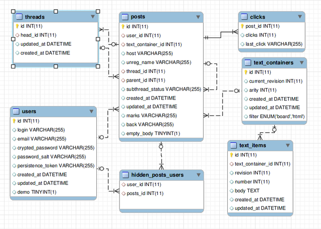 The image above was generated with "MySQL Workbench" tool. If you supply a database with properly set up foreign keys, which I did manually, as Rails doesn't set them up for compatibility reasons, it will show you a nice entity-relationship diagram.