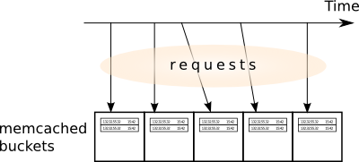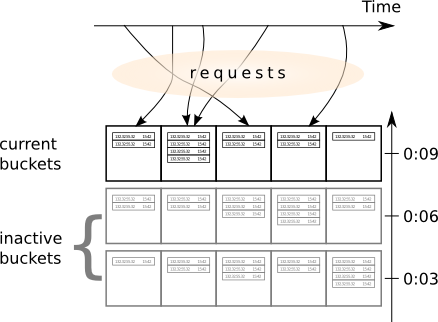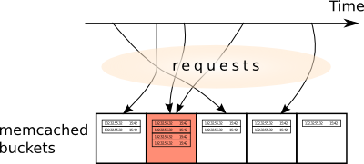We may utilize another highly-accessible resource, which usage is however totally discouraged in building a reliable distributed algorithm. We have the clock that are easy and fast to access. The clock provides us with a natural discriminator: each, say, three seconds, abandon the old hash bucket, and start a new that will be responsible for storing the requests for the next three seconds. Given current time, we can always find the "layer" of the cache we should randomly select the bucket from.