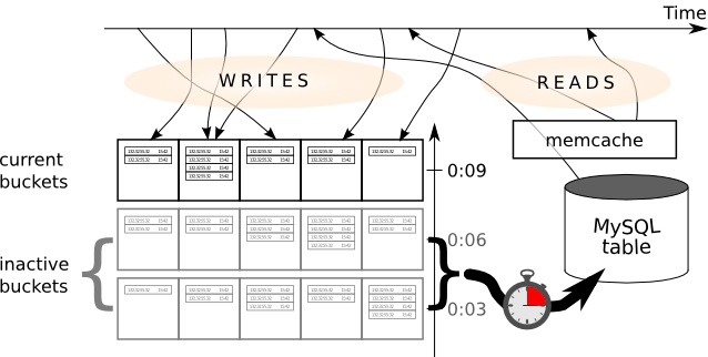 After the page has been served, the request notifies the wide cache about the access to the site. First, it determines the "row" of the cache by rounding the current time in seconds since the Epoch down to the number divisible by three. Then, it determines the "column" by choosing a random number from 1 to 15. These numbers are appended; they form a unique identifier of a memcache entry. The website then reads the table from that entry, appends a row, and updates the same entry.