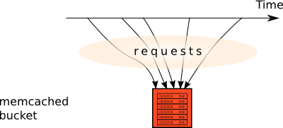 We could try to use memcached to store the SQL table. itself. Indeed, that table may be viewed as an array of rows, so we could just read the table, append a row, and write the result back. However, for the sake of performance, memcached doesn't support any locking, so we can't just store the table described in the naive approach in a cache bucket. Two threads may read the array, then both append the next row, and both write, one row being discarded. This is a classical race condition. And my aim was to serve 30-40 requests per second, which means that race conditions that appear if this approach is used were inevitable.