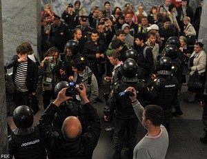 (photo by Ivan Afanasiev). The largest "Strategy 31" time-based protest I attended (January 2011). A protester features a sign with a protest logo.