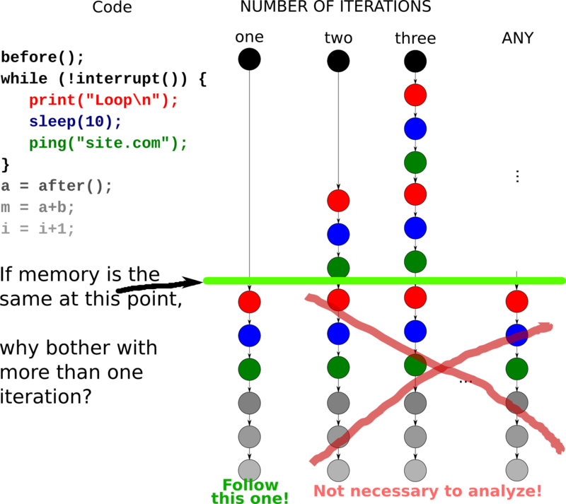 At this point we notice that, wherever the program counter is, the behavior of program is completely predetermined by the values of all variables given the subsequent user input is also predetermined. For example, assume that at line, say, 15, in the middle of the loop, the values of all variables, and of the all readable memory cells are the same on the 2nd and the 3rd iterations of the loop. Immediately follows that the paths that "start" at each of these locations (given the equivalence of the memory) have a one-to-one match between these two "classes". Getting back to the original problem, if we prove that no path that only iterates two times has a bug on it, then the paths where the loop iterates three times or more also don't have bugs on them. This is how we can decrease the amounts of paths to analyze from infinity to several.
